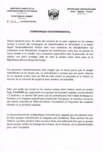 Dans ce document signé de sa main, il met en garde contre une rumeur visant à discréditer et fragiliser les excellentes relations diplomatiques et bilatérales entre la Centrafrique et la République démocratique du Congo. Le communiqué précise :