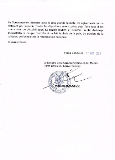 Interrogé par Centrafrique Check, Maxime Balalou, ministre de la Communication et des Médias et porte-parole du gouvernement, a d’abord exprimé son intention de vérifier la véracité de ces allégations avant de réagir officiellement. Toutefois, il a rapidement publié un communiqué le 13 mars 2025, dans lequel il dénonce des manœuvres de manipulation orchestrées par les ennemis de la paix en Centrafrique.