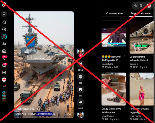En conclusion, la vidéo qui prétend montrer l’arrivée en RDC d’un porte-avions récemment acquis est fausse. Nos recherches ont révélé que cette vidéo a été créée de manière frauduleuse grâce à l’intelligence artificielle, sans aucune base factuelle.