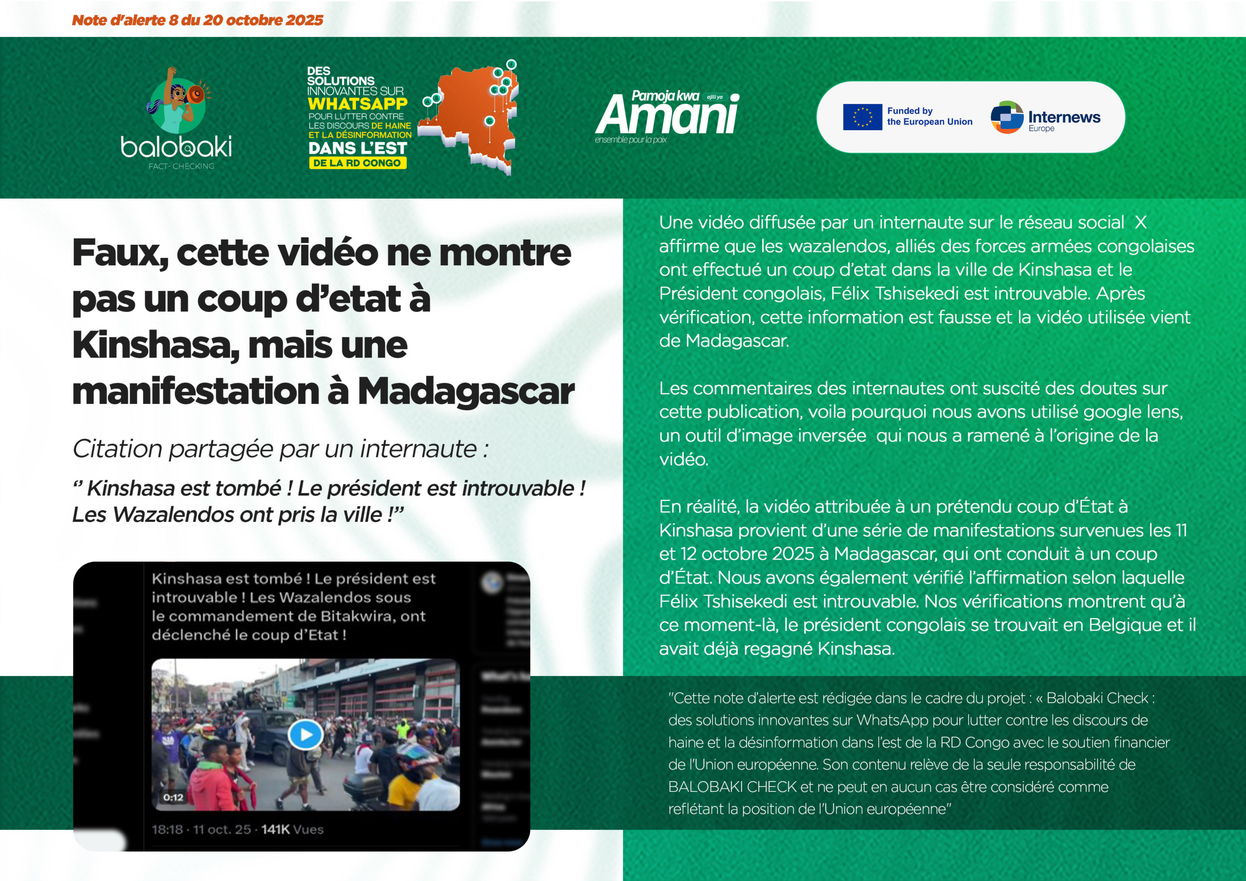 En réalité, la vidéo attribuée à un prétendu coup d’État à Kinshasa provient d’une série de manifestations survenues les 11 et 12 octobre 2025 à Madagascar, qui ont conduit à un coup d’État. Nous avons également vérifié l’affirmation selon laquelle Félix Tshisekedi est introuvable. Nos vérifications montrent qu’à ce moment-là, le président congolais se trouvait en Belgique et il a déjà regagné Kinshasa.