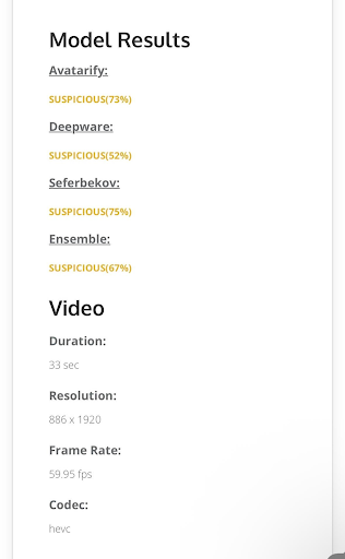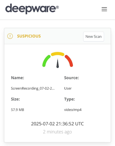 Nous avons effectué une analyse avec le logiciel de détection de manipulation IA « Deepware.ai ».  Le résultat  a révélé une activité suspecte de 67 % de manipulation dû à l’intelligence artificielle.  Les indicateurs de cet outil démontrent une probable modification par l’IA ou effets numériques dans cette vidéo.