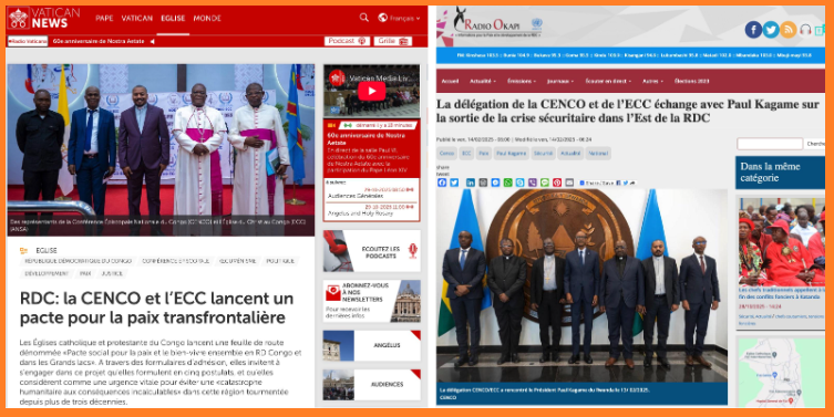 Captures d’écran d’un article de Vatican News sur la création du pacte pour la paix transfrontalière et d’un article de Radio Okapi la rencontre entre les leaders religieux et Paul Kagame