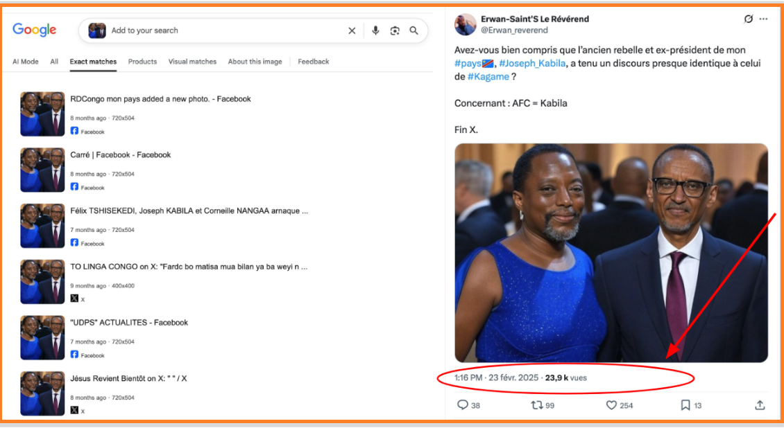 Une recherche par image inversée sur Google nous permet de découvrir que la photo manipulée de Paul Kagame et de Joseph Kabila a été utilisée plusieurs fois pour nourrir d’autres narratifs, notamment politique, liées à la situation de crise dans l’Est de la RDC. L’une des publications les plus virales a été faite sur X le 23 février 2025 par le compte Erwan-Saint’S Le Révérend. Dans cette publication, l’auteur indexe une similarité de discours entre Paul Kagame et Joseph Kabila.