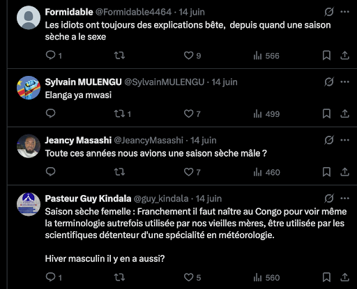 Parmi les réactions qui nous ont interpellées, on peut lire par exemple : « La pluie, la sécheresse et toute la condition atmosphérique viennent de DIEU, le seul initiateur, directeur et créateur. Cher météorologue, sois tranquille afin que le maître se prononce ». « La nature ne veut plus Tshilombo au pouvoir ». « Des prévisions météo bidon, j’ai honte de nos météorologues. Sans aucune alerte, les gens meurent comme si l’État congolais ne vous donnait pas de moyens pour ce travail ». « Un détournement climatique ! ».