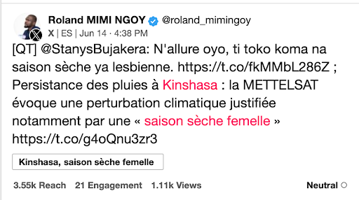 L’analyse temporelle met en évidence un pic d’activité le 14 juin 2025, soit 24 heures après la publication d’un communiqué de la METTELSAT (Agence nationale de météorologie et de télédétection par satellite de la RDC). Ce communiqué faisait état d’une perturbation climatique liée à des anomalies saisonnières, écrites par l’expression singulière de “ saison sèche femelle”, une formulation non conventionnelle dans le lexique météorologique.