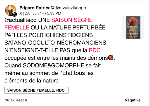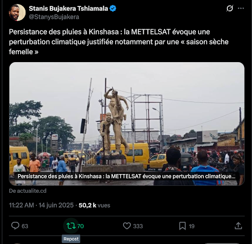 Certains internautes vont même jusqu’à pointer du doigt la responsabilité de l’État ou même évoquer les forces surnaturelles. Dans une publication sur X le 14 juin 2025, le journaliste Steve Wembi (plus de 486 900 abonnées sur X) a alerté sur les inondations causées par la pluie diluvienne. Quelques jours plus tôt, en avril 2025, il avait, dans une publication sur X, pointé « l’incompétence des dirigeants » qui expose les kinois aux répercussions des pluies diluviennes.