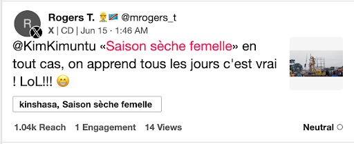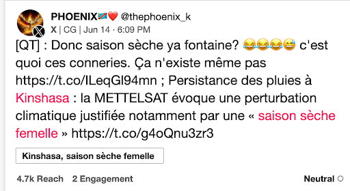 L’analyse temporelle met en évidence un pic d’activité le 14 juin 2025, soit 24 heures après la publication d’un communiqué de la METTELSAT (Agence nationale de météorologie et de télédétection par satellite de la RDC). Ce communiqué faisait état d’une perturbation climatique liée à des anomalies saisonnières, écrites par l’expression singulière de “ saison sèche femelle”, une formulation non conventionnelle dans le lexique météorologique.
