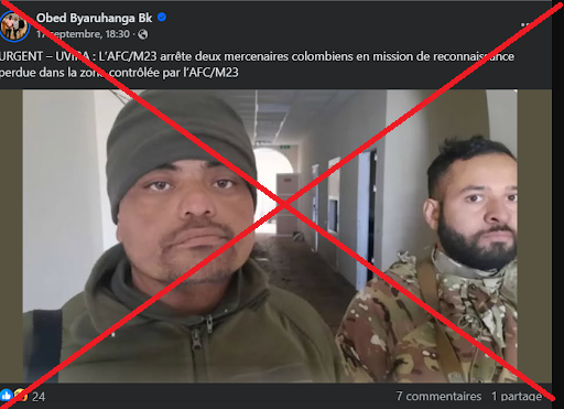 Depuis janvier 2025, plusieurs territoires de l’Est de la RDC, notamment les grandes villes de Goma et Bukavu, sont passés sous le contrôle du mouvement rebelle AFC-M23. La ville d’Uvira, dans la province du Sud-Kivu, est à son tour menacée par cette rébellion. C’est dans ce contexte qu’a circulé cette publication, accompagnée d’une photo, affirmant l’arrestation de deux mercenaires colombiens à Uvira.