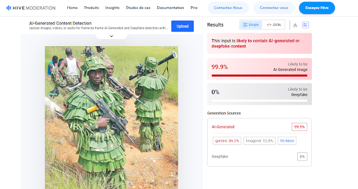 Concernant l’image accompagnant la publicationun détail a retenu notre attention : les feuilles de bananier portées par la personne mise en avant présentent, au niveau de la hanche, une coloration similaire à celle de sa tenue, un élément visuellement suspect . Nous avons donc soumis l’image à Hive moderation, un outil de détection de contenus générés  par intelligence artificielle. L’analyse indique une probabilité supérieure à  99 % que l’image ait été créée par l’IA.