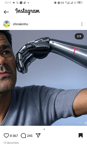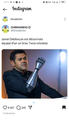 Sur le réseau social Instagram, un internaute a posté deux images de l’humoriste franco-marocain Jamel Debbouze avec un bras métallique, prétendument qu’il porterait un bras Tesla robotisé. Après nos recherches, nous en arrivons à la conclusion que l’image est très probablement le fruit de l’intelligence artificielle (IA).