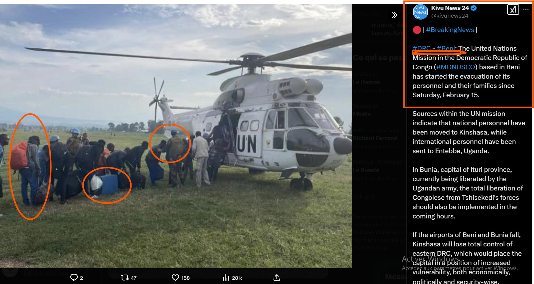 Traduction en français : #BreakingNews |#RDC – #Beni : La Mission des Nations Unies en République démocratique du Congo (MONUSCO), basée à Beni, a commencé l’évacuation de son personnel et de leurs familles depuis samedi 15 février. Des sources au sein de la mission onusienne indiquent que le personnel national a été déplacé vers Kinshasa, tandis que le personnel international a été envoyé à Entebbe, en Ouganda. À Bunia, capitale de la province de l’Ituri, en cours de libération par l’armée ougandaise, il est impératif que les forces de Tshisekedi devrait également être mise en œuvre dans les prochaines heures. Si les aéroports de Beni et Bunia tombent, Kinshasa perdra le contrôle total de l’est de la RDC, ce qui la placerait dans une position de vulnérabilité accrue, tant sur le plan économique que politique et sécuritaire.»